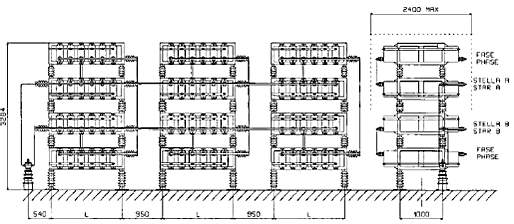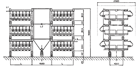 Батареи с более высокой мощностью и напряжением, до 220 kV. Используются стандартные однофазные элементы.