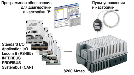 Преобразователи серии 8200 Motec обладают многими возможностями преобразователей серии 8200 Vector: управление, диагностика, функциональные возможности и поведение приводов идентичны. Это оказывается выгодным в случае комбинирования централизации и децентрализации. Для управления Вы можете использовать на выбор или панель управления и настройки ПЧ, или ПК с использованием программного обеспечения GDC easy.